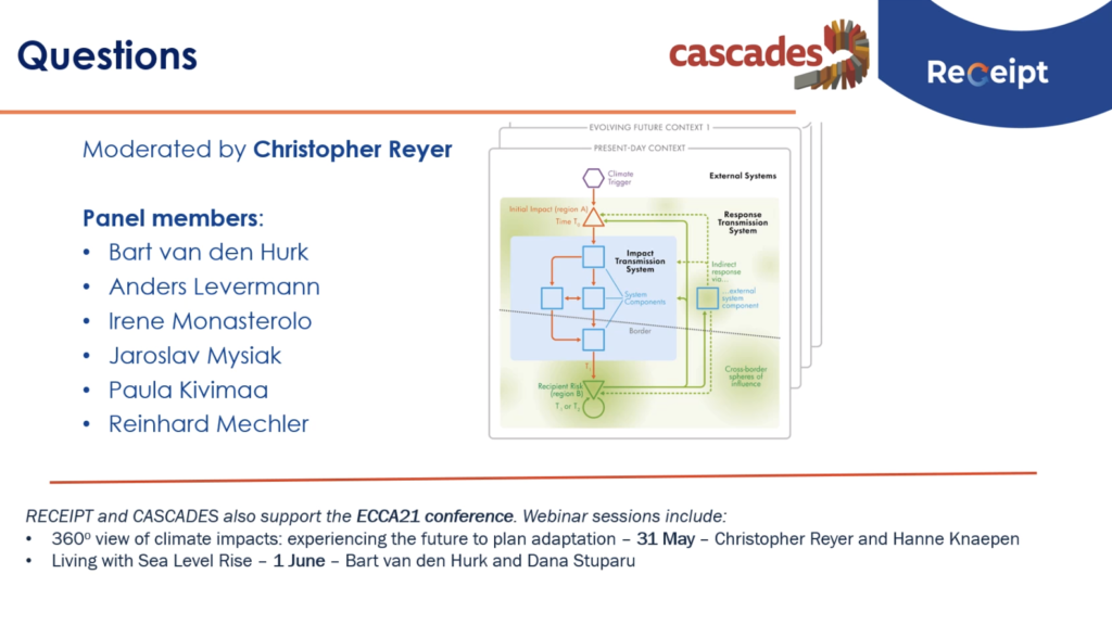 More than 65 scientists and policy makers came together on Wednesday 14 April 2021. They attended a webinar organized by the H2020 funded projects RECEIPT and CASCADES and hosted by DG CLIMA and EASME. The projects have reflected on the impacts of global change on Europe.