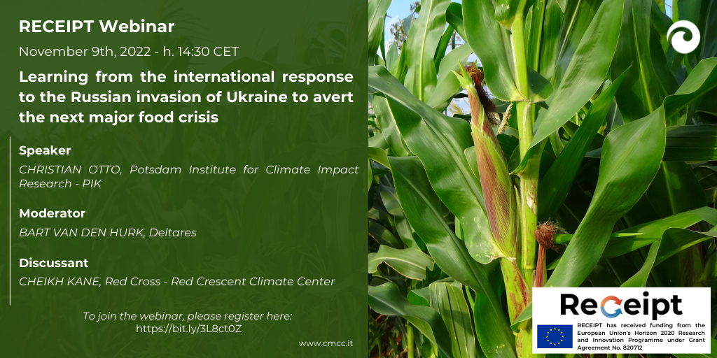 A new RECEIPT webinar “Learning from the international response to the Russian invasion of Ukraine to avert the next major food crisis” with Christian Otto, Bart van den Hurk and Cheikh Kane will take place on 9 November at 2:30pm CET on Zoom.