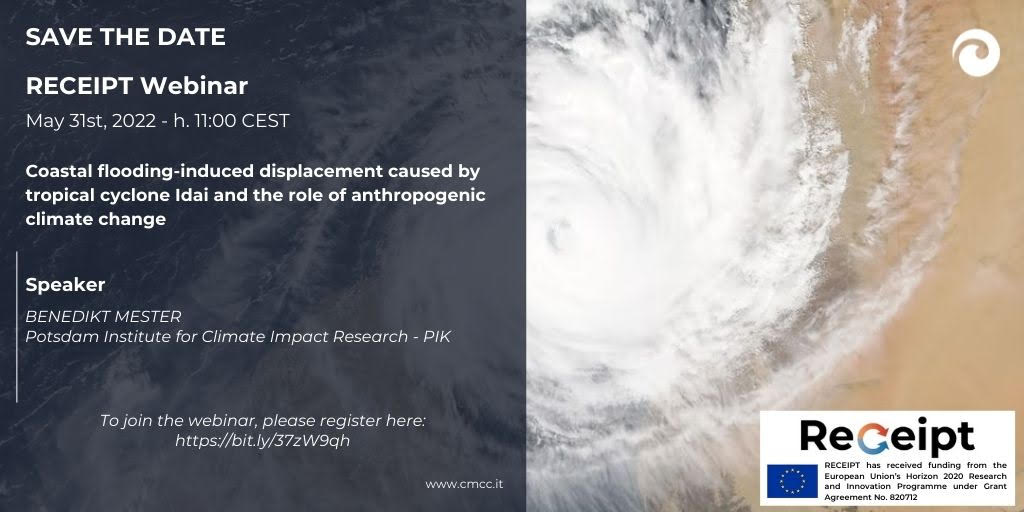 RECEIPT is organising the webinar “Coastal flooding-induced displacement caused by tropical cyclone Idai and the role of anthropogenic climate change” by Benedikt Mester from Postdam Institute for Climate Impact Research. The webinar will take place on 31 May at 11:00 CEST. Further information and registrations can be found here.